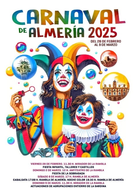 El cartel anunciador del Carnaval de Almería 2025 es obra de Rubén Lucas García, artista de Torreagüera (Murcia) y ganador del concurso organizado por FEMACA. La ilustración presenta dos arlequines, una mujer y un niño, en una explosión de color con elementos emblemáticos de Almería como el Pingurucho, la fachada del Ayuntamiento y la Alcazaba.