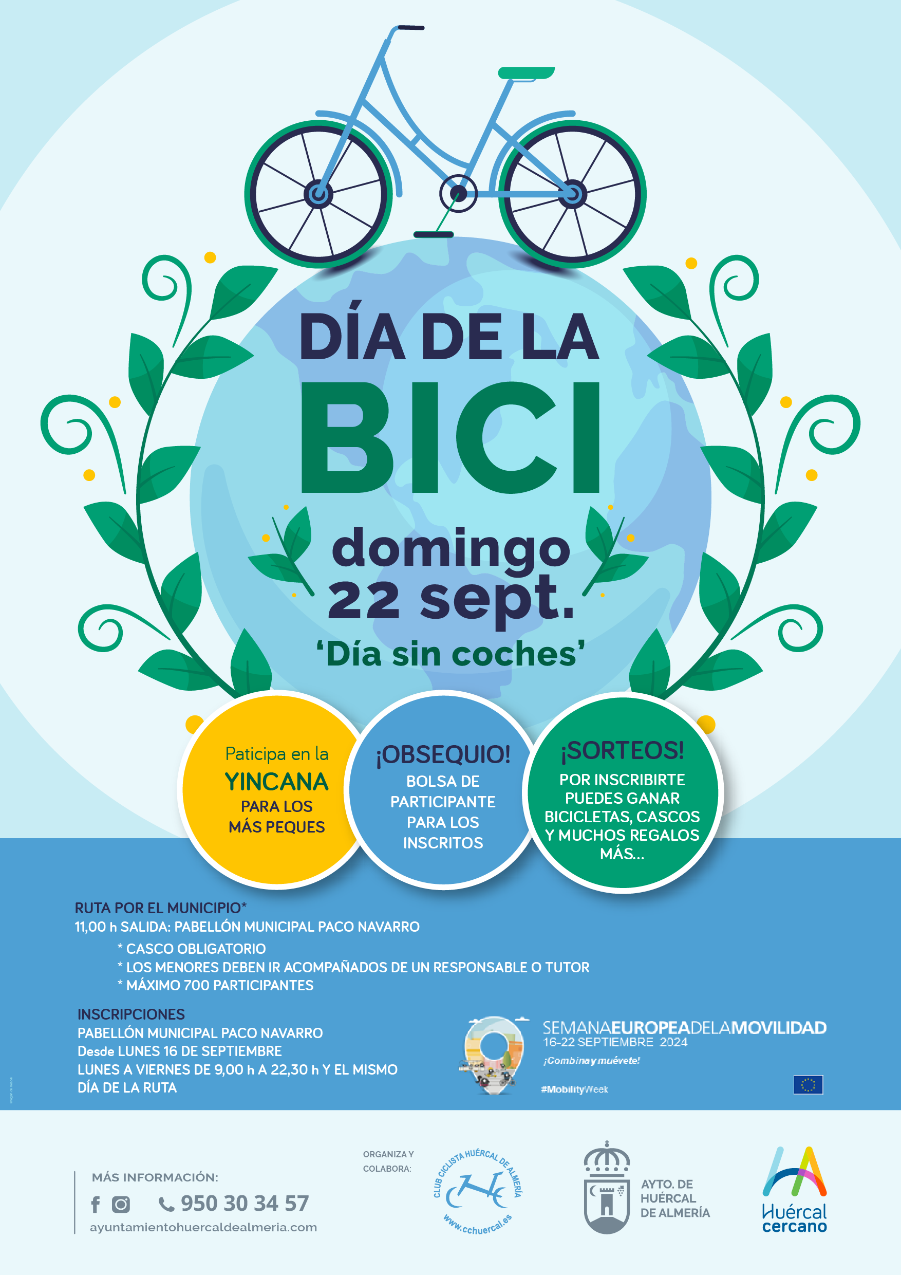 El Ayuntamiento de Huércal de Almería celebrará un año más la Semana Europea de la Movilidad, que se celebra del 16 al 22 de septiembre, con su tradicional ‘Día de la Bici’, una marcha ciclista que se llevará a cabo el domingo 22 de septiembre con salida y llegada en el Pabellón Municipal Paco Navarro de la localidad huercalense.