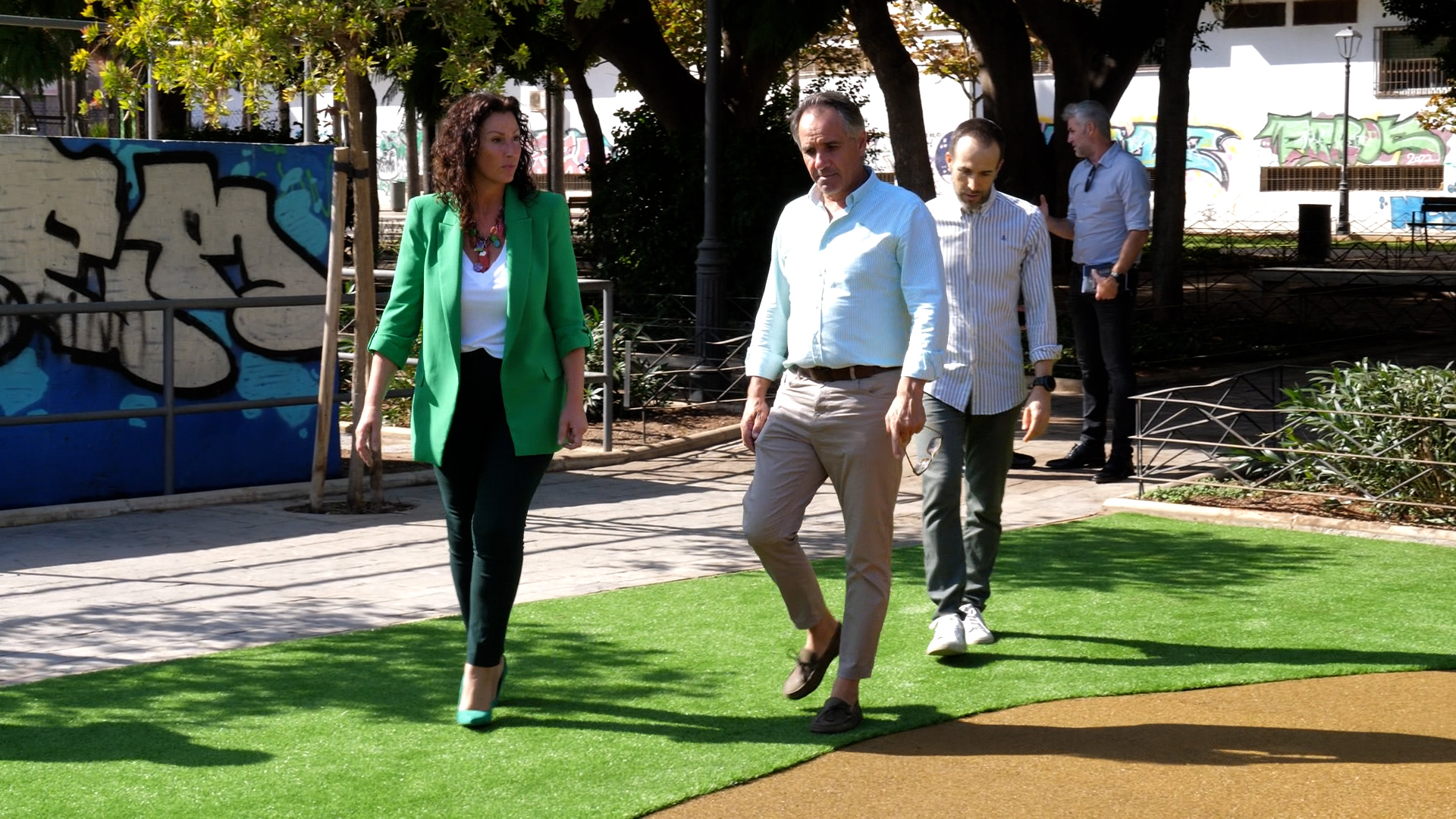 Acompañada por el concejal de Agricultura, Agua y Zonas Verdes, Juan José Segura, y por técnicos del Área, la alcaldesa ha comprobado el resultado de unos trabajos que han consistido en la retirada del suelo calcinado, FOAM y césped artificial, con una superficie de 345 m²; en la reposición de los juegos infantiles y demás elementos que componen el área, como asientos planos y cestas de bebe, con sus cadenas nuevas; así como en la instalación de pavimento de seguridad en una superficie de 206 m² (compuesto de SBR y EPDM, gránulos de caucho para amortiguar la zona y con un diseño de hojas), y en la instalación de pavimento continuo de césped artificial, con la integración del escudo de Almería, con superficie de 139 m².