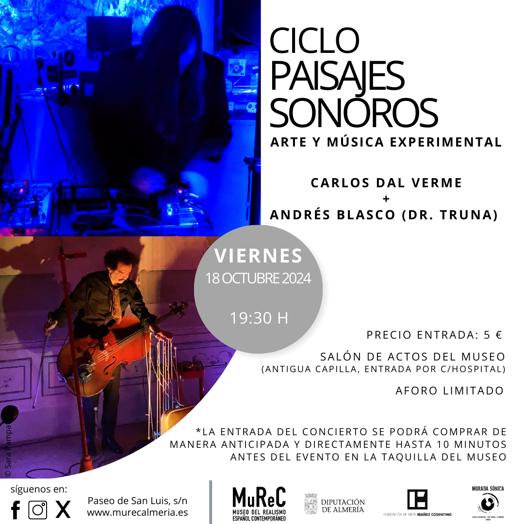 El Museo del Realismo Español Contemporáneo de Almería, MUREC, estrena el viernes 18 de octubre el espectáculo de arte y música experimental con los artistas Carlos Dal Verme y Andrés Blasco (Dr Truna) con la colaboración del colectivo cultural Morada Sónica dentro del Ciclo Paisajes Sonoros. La actuación se llevará a cabo a las 19:30 horas en el Salón de Actos del Museo, en la antigua capilla con entrada por la calle Hospital, con aforo limitado y el precio de la entrada a 5 euros.