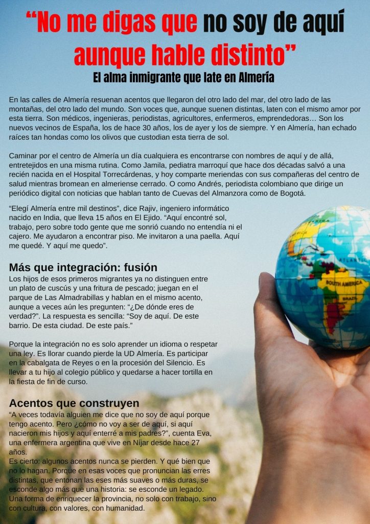 En las calles de Almería resuenan acentos que llegaron del otro lado del mar, del otro lado de las montañas, del otro lado del mundo. Son voces que, aunque suenen distintas, laten con el mismo amor por esta tierra. Son médicos, ingenieras, periodistas, agricultores, enfermeros, emprendedoras… Son los nuevos vecinos de España, los de hace 30 años, los de ayer y los de siempre. Y en Almería, han echado raíces tan hondas como los olivos que custodian esta tierra de sol.